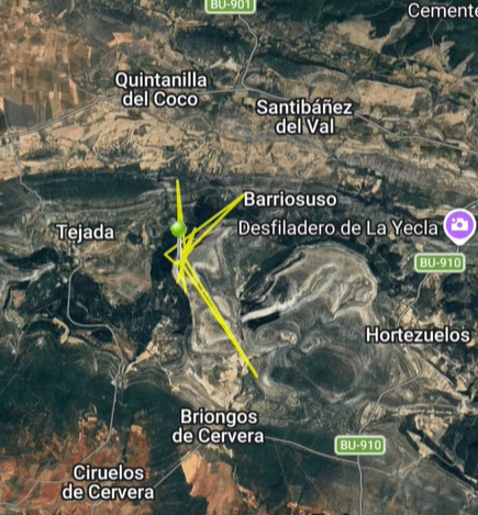 Por desgracia en este tipo de proyectos no todo son buenas noticias. El pasado martes 2 de agosto Polux volaba de Burgos a una zona próxima a Hurones. Por desgracia decidió posarse en una torreta eléctrica que acabó con su vida. Tras hacer el levantamiento del cuerpo por parte de los agentes forestales de la JCL y realizar necropsia en el centro de recuperación de fauna silvestre, se confirma la muerte por electrocución. El mismo martes, tras analizar la información de su GPS vimos que había demasiadas localizaciones en un mismo punto, cosa que nos resultó extraña. Esperamos a la siguiente descarga de datos y efectivamente vimos que no había actividad y nos acercamos al lugar sabiendo lo que nos íbamos a encontrar ya que en el mapa se apreciaba que el halcón estaba debajo de una torreta eléctrica. El periodo de vida de Polux ha sido de 25 dias desde su liberación.