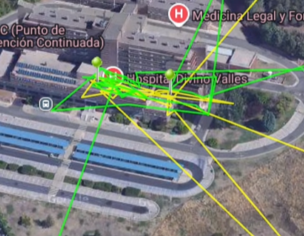 El día 6 de febrero Castor volaba perfectamente y su GPS nos enviaba correctamente sus localizaciones. Su bateria se encontraba al 80%. El día 7 el emisor no descargó los datos y comprobamos que su bateria había bajado de repente al 60%. Decidimos esperar al día siguiente a ver que pasaba. El día 8 su bateria se encontraba al 40% y seguía sin enviar datos. Todo indicaba que Castor estaba atrapado en algún sitio donde no recibía luz solar y no había cobertura. El día 9 tras rastrear todos sus movimientos anteriores concluimos en que debía estar atrapado en un edificio de la calle Averroes. El día 10 nos desplazamos a Burgos y localizamos el edificio. Debido al difícil acceso, contactamos con el equipo de bomberos de Burgos quienes se desplazaron a la zona rápidamente. Tras buscar toda la tarde no dimos con Castor. Sabíamos que estaba ahí y sabíamos que estaba vivo, ya que el acelerometro del emisor nos mostraba que había actividad. El domingo 11 de mañana volvemos a la carga con los bomberos y tras buscar durante horas Castor aparece al otro lado de una rejilla de ventilación en la que se había colado seguramente mientras perseguía una paloma y luego no le permitía salir.